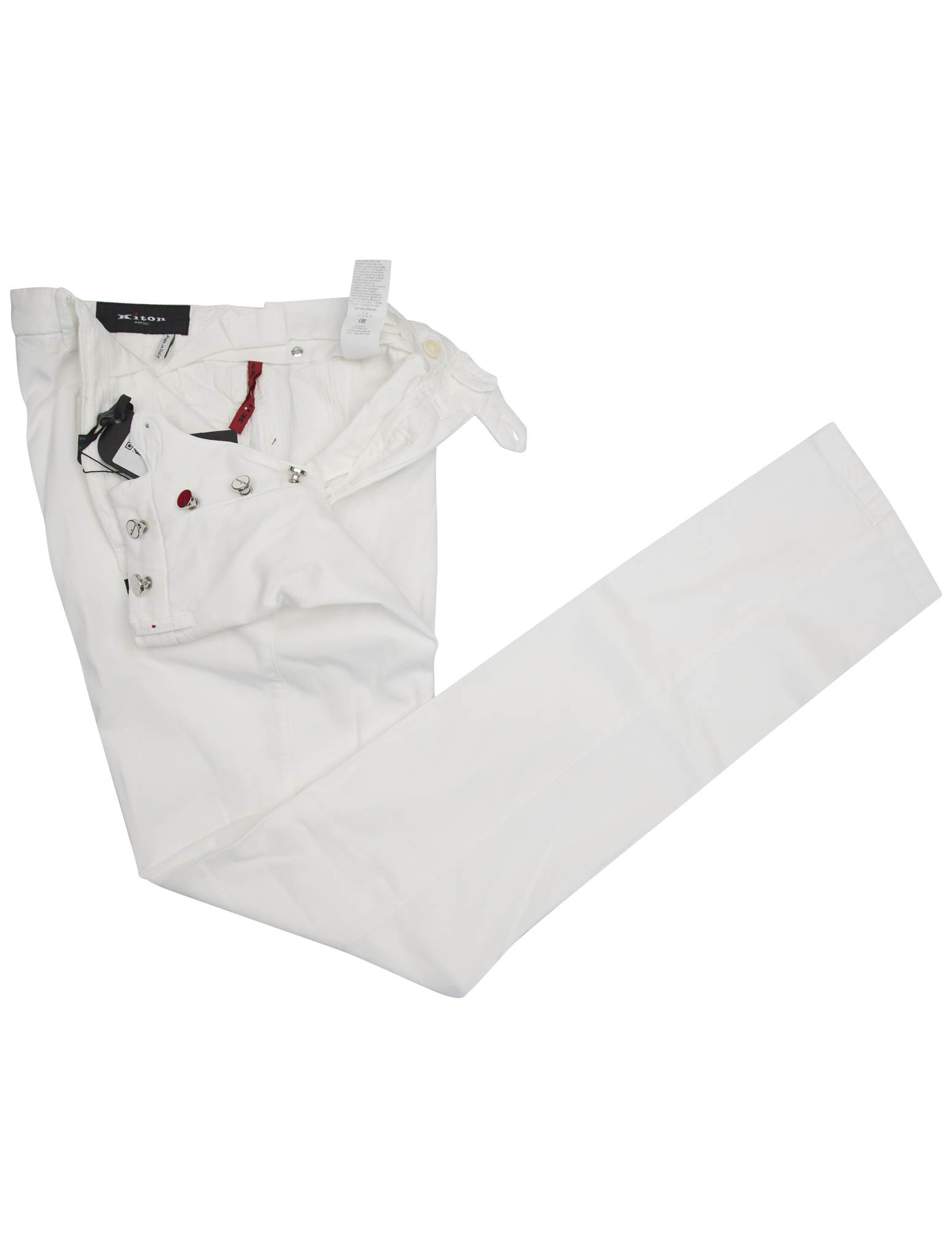 Белые брюки Kiton из лиоцелла и эластана (EA) сочетают в себе экологичную роскошь и современную утонченность. Лиоцелл имеет гладкую, дышащую текстуру, дополненную эластичным эластаном. Эти брюки с классическими пуговицами демонстрируют непоколебимую приверженность Kiton устойчивой моде и итальянскому мастерству.