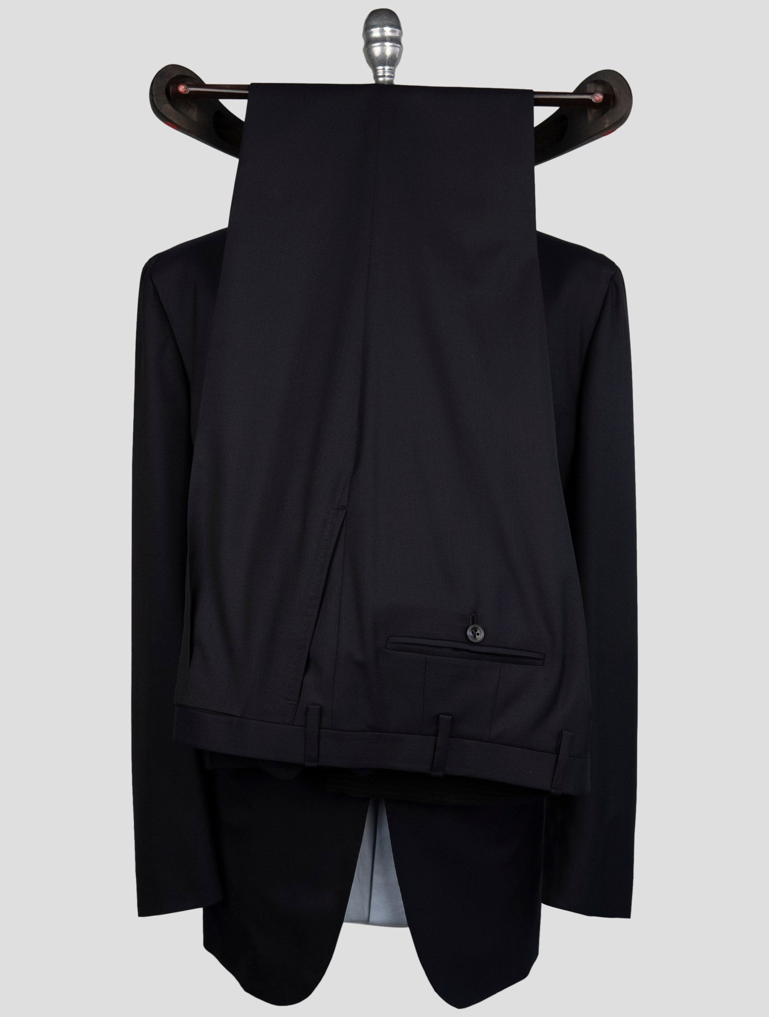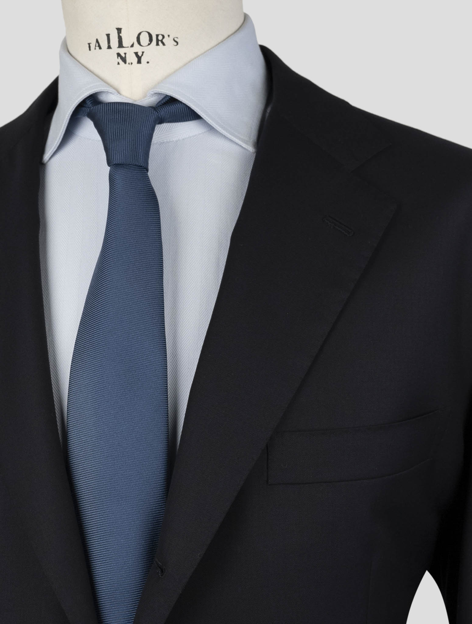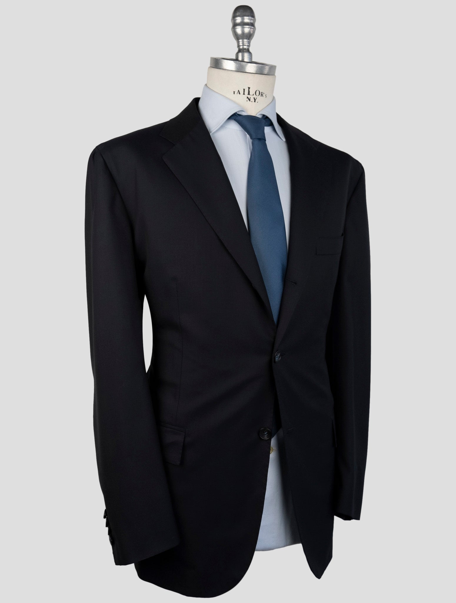 Kiton Blue Wool 14 Micron Suit The Kiton blue suit represents the pinnacle of Italian tailoring, crafted from 100% wool with an exceptional 14-micron fiber count. This ultra-fine wool construction delivers superior softness and breathability while maintaining a lightweight feel that ensures all-day comfort. This three-button suit features structured shoulders and a tailored silhouette that flatters the modern professional. The deep blue tone offers versatility for business meetings, formal event