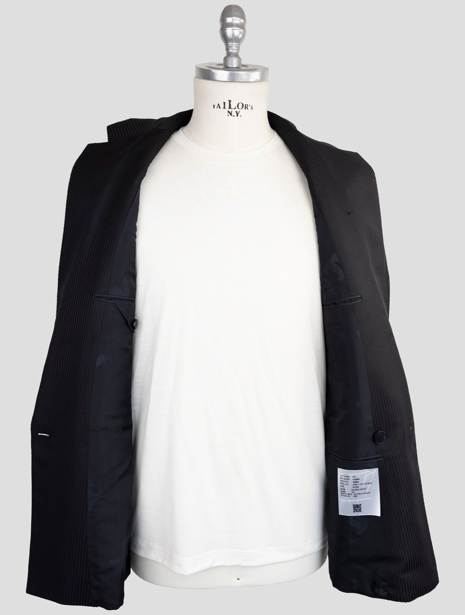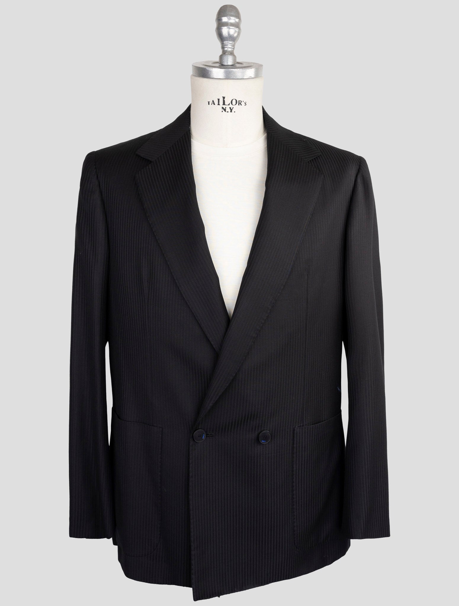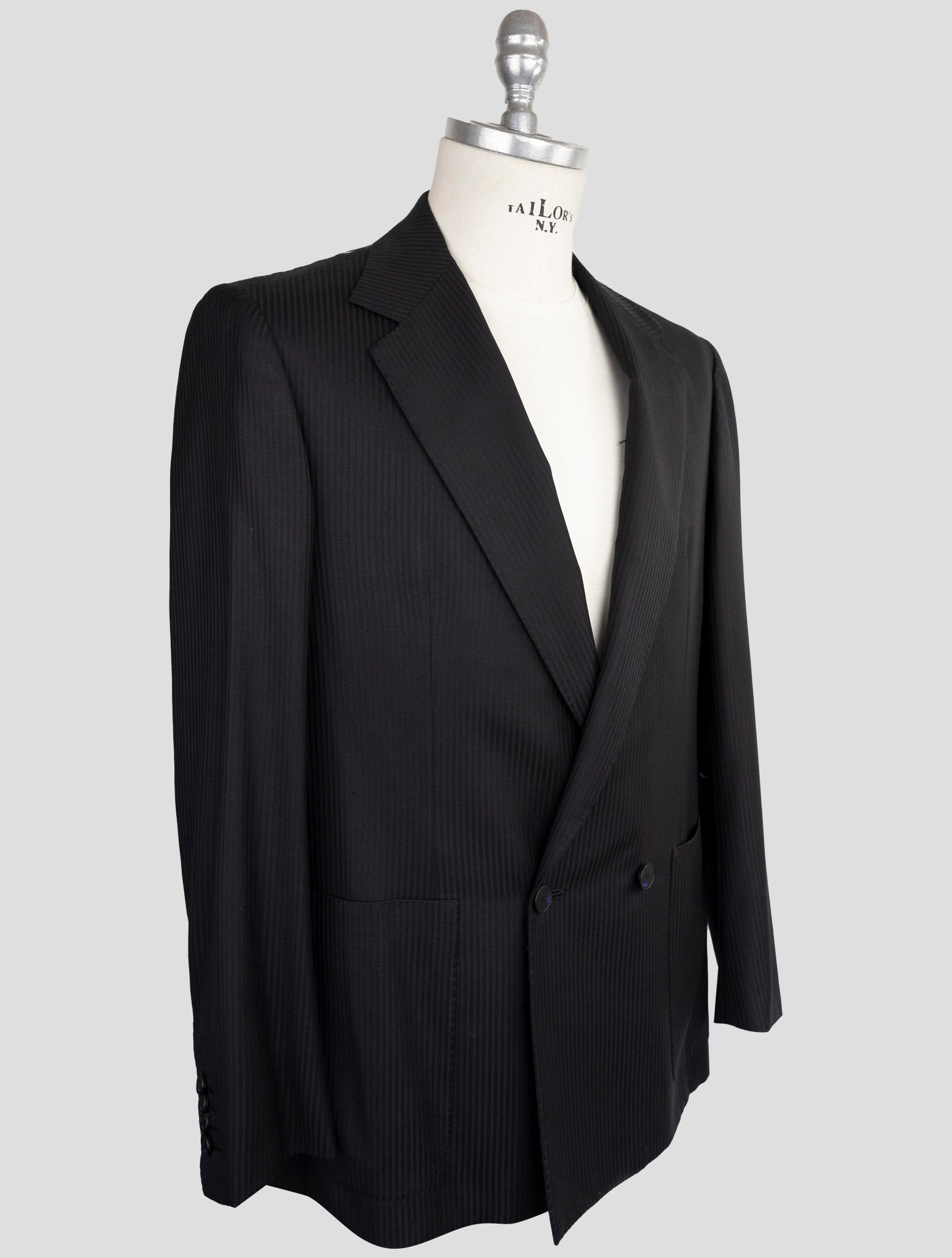 Двубортный костюм в тонкую полоску черного цвета Kiton KNT — 100% натуральная шерсть Двубортный костюм в тонкую полоску черного цвета Kiton KNT представляет собой образец превосходного итальянского пошива, изготовленный из 100% натуральной шерсти, обеспечивающий превосходное качество и комфорт. Этот изысканный костюм с классическим узором в тонкую полоску и застежкой доппио петто (двубортный) придает неподвластную времени элегантность и профессиональный авторитет. Премиум-строительство и усилитель; Дизайн Этот костюм итальянского производства представляет собой тщательно выполненную вручную конструкцию со структурой.