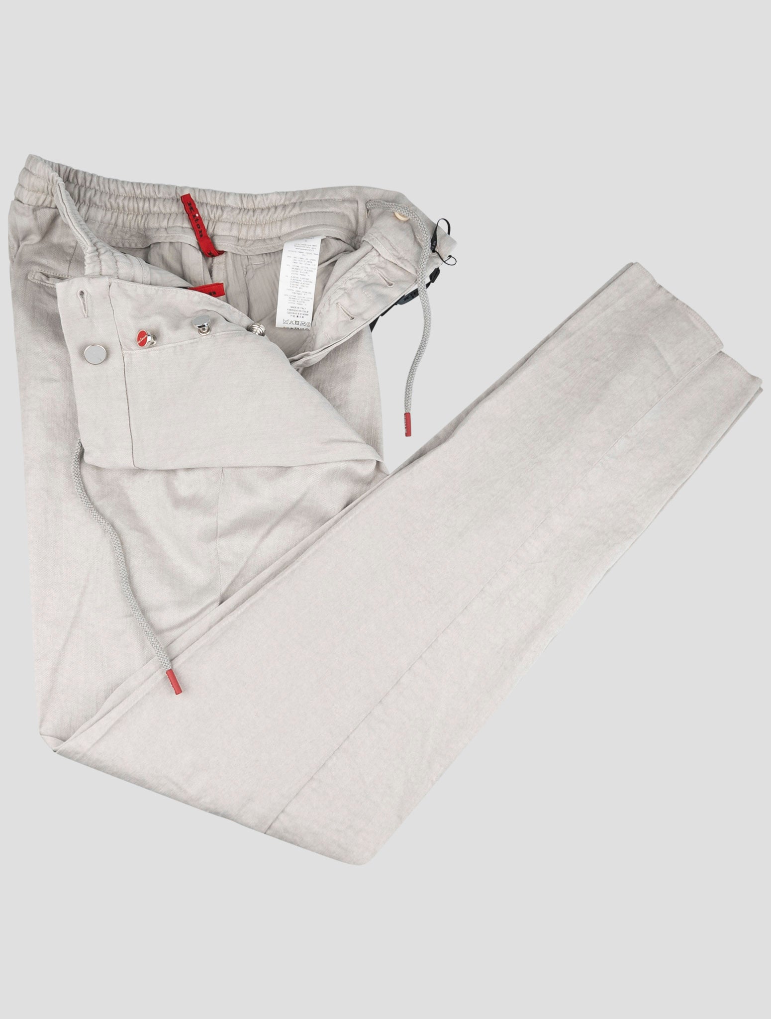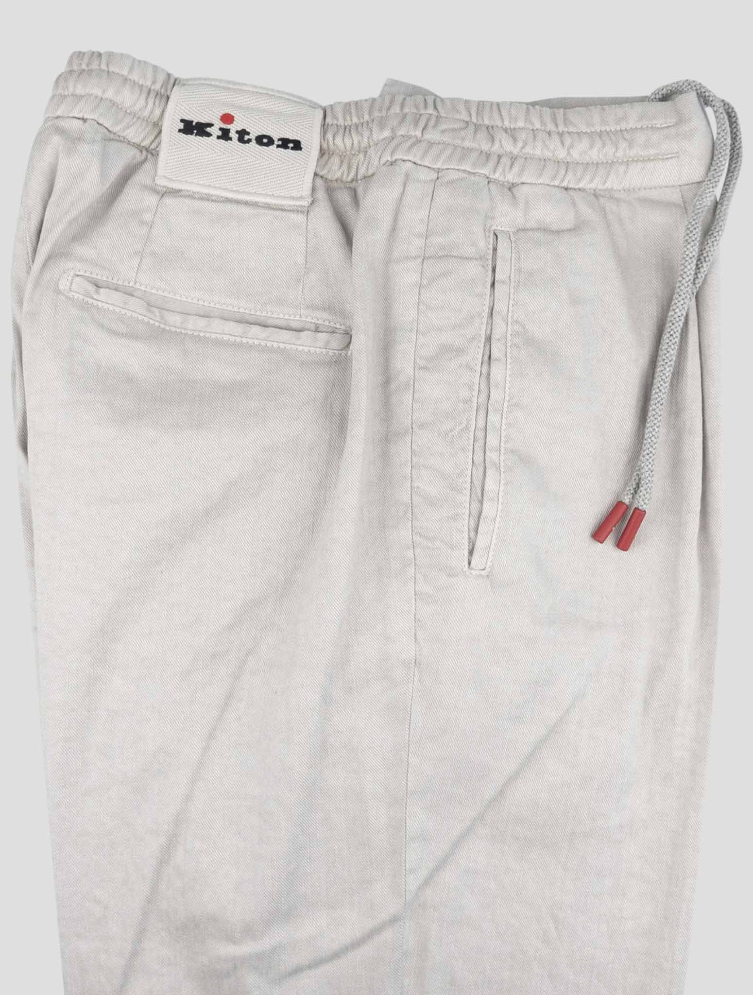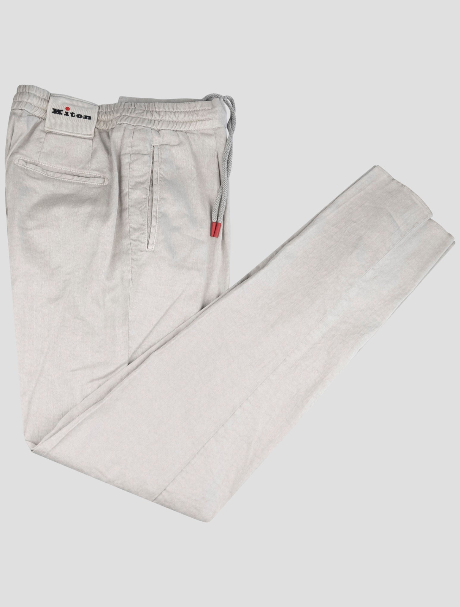 Серые льняные брюки из смеси хлопка Kiton Эти серые брюки Kiton состоят из 65 % льна, 34 % хлопка и 1 % эластана. Эти дышащие летние брюки сохраняют структуру и обеспечивают комфорт. Смесь натуральных волокон обеспечивает впитывание влаги и мягкость, подходящую для теплых погодных условий. Конструкция и дизайн. Сделанные вручную в Италии, эти брюки с застежкой на пуговицы имеют классический силуэт и однотонный серый узор. Итальянское мастерство обеспечивает точный пошив с вниманием.