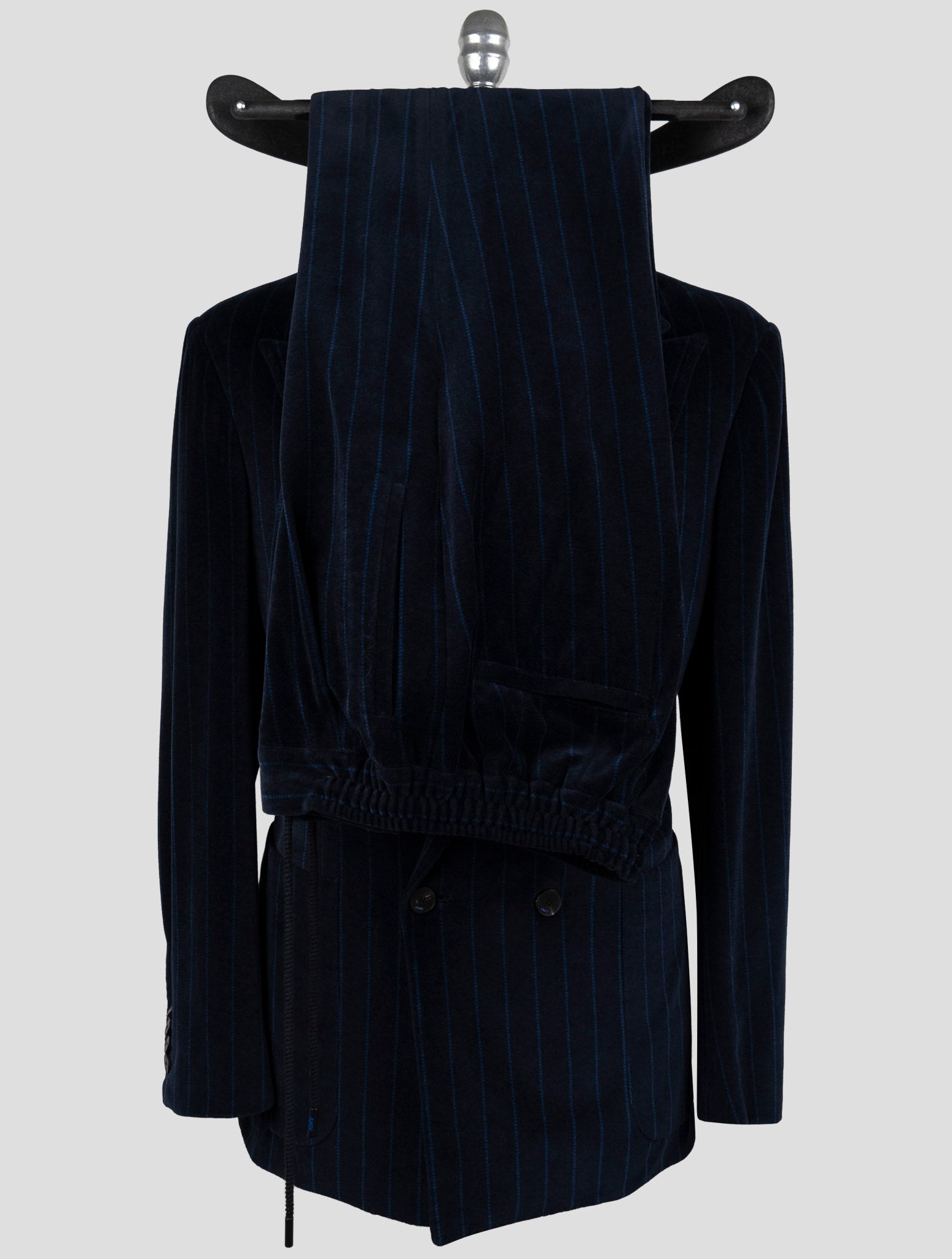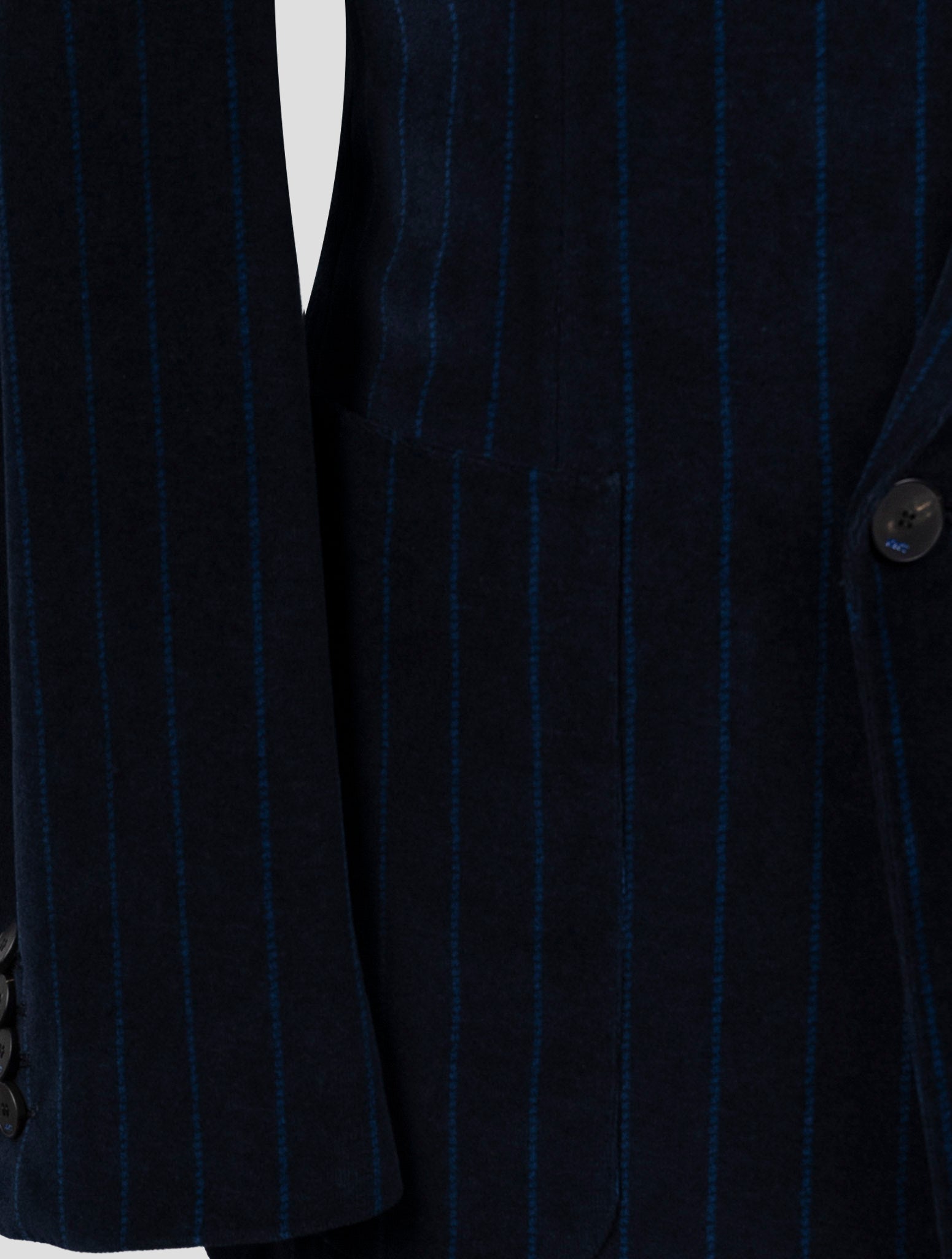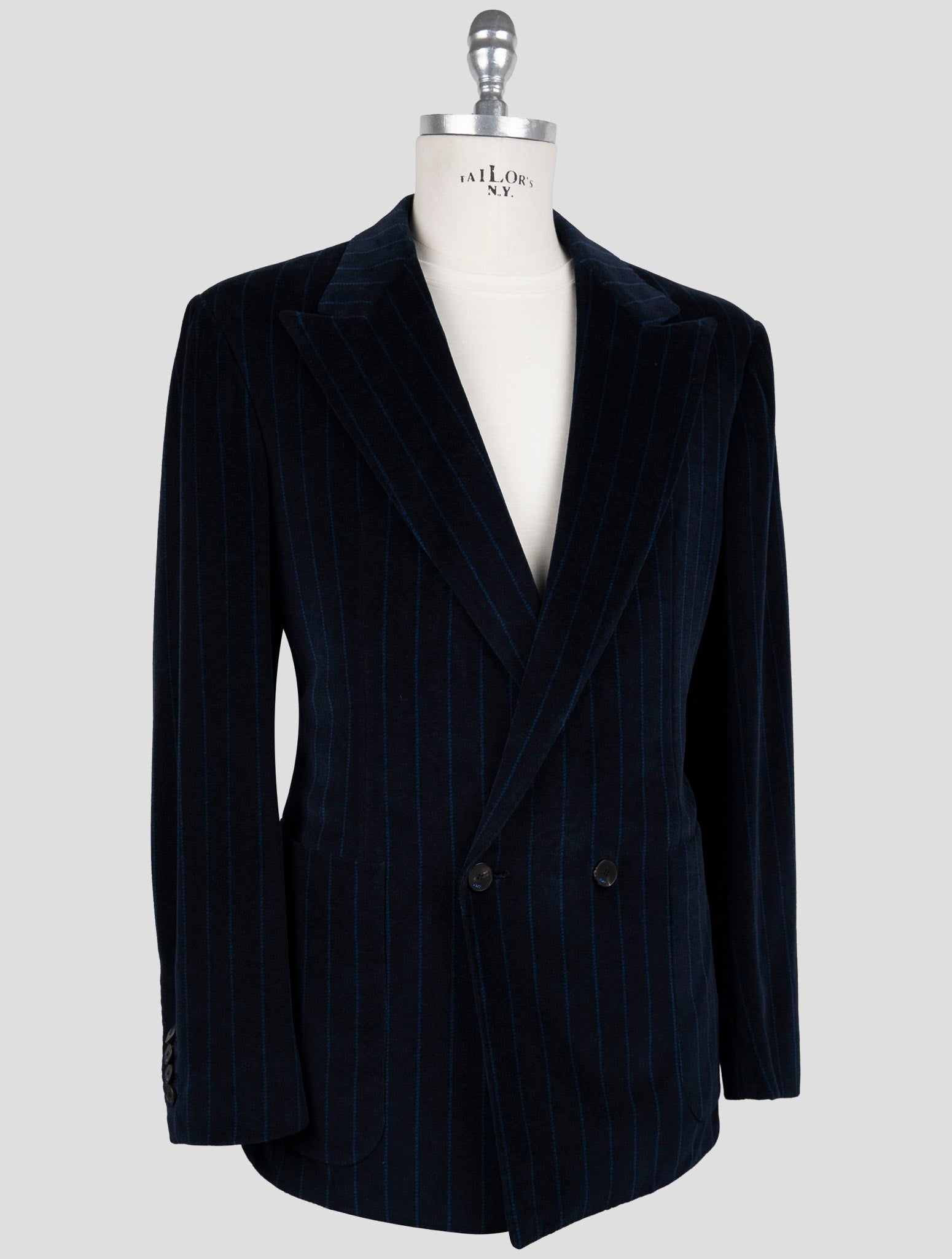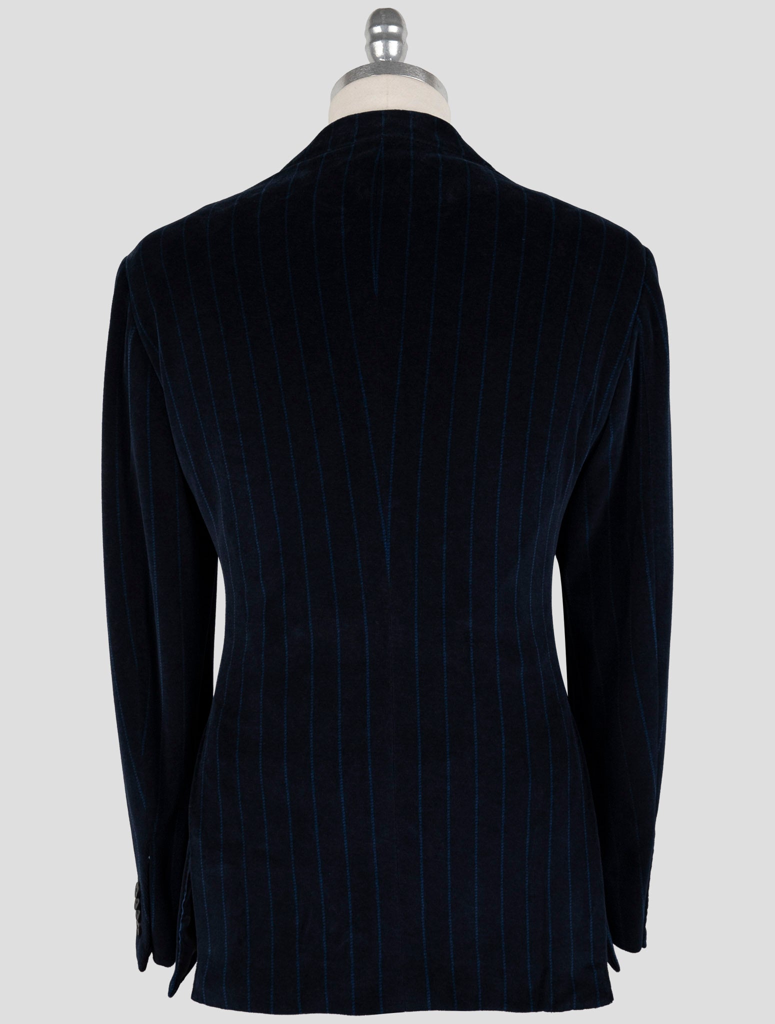 Синий бархатный двубортный костюм в полоску Kiton KNT Синий бархатный полосатый костюм Kiton KNT олицетворяет итальянское мастерство во всей красе. Этот двубортный костюм, изготовленный из смеси премиум-класса (56 % хлопка и 44 % полиэстера), украшен тонкими вертикальными полосками на мягкой бархатной отделке, которая придает исключительную текстуру и глубину. Костюм демонстрирует классическое неаполитанское портняжное наследие с современной эстетикой. Двубортный дизайн обеспечивает четкую структуру, сохраняя при этом комфорт.