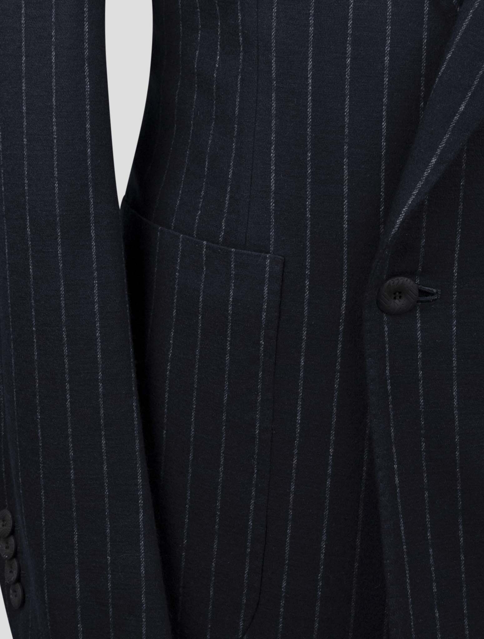 Двубортный костюм Kiton KNT из натуральной шерсти и хлопка в синюю полоску Костюм Kiton KNT из натуральной шерсти и хлопка в синюю полоску представляет собой образец превосходного итальянского пошива. Этот изысканный двубортный костюм состоит из 77 % натуральной шерсти и 23 % хлопка, что обеспечивает оптимальный комфорт и воздухопроницаемость, сохраняя при этом структуру в течение дня. Этот костюм, изготовленный вручную в Италии как часть коллекции KNT (Kiton New Texters), имеет тонкий узор в синие полосы, который добавляет визуальный интерес, но не перегружает.